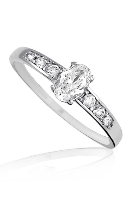 Zásnubní prsten vyroben z bílého čtrnácti karátového zlata ryzosti 585/1000, v lesklé povrchové úpravě s bílými zirkony. jeden oválný středový kámen a 6 postraních zirkonů. Váha prstenu je 1,20 g pro velikost 54. Prstýnek vyrábíme ve všech velikostech. K prstýnku už je zahrnuta krabička na kterou mužeme vyrýt věnování. Rytí a velikost prtenu nám napiśte do poznámky v objednávce ( třetí krok v košíku ).